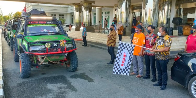Kutai Timur – Wakil Bupati Kutai Timur, Dr H Kasmidi Bulang, ST., MM. , melepas sejumlah pecinta kendaraan off-road yang tergabung dalam Ves Community Kabupaten Kutai Timur (Kutim), yang akan mengikuti ajang “Overland Kodam VI Mulawarman” di Kota Balikpapan, selama tiga hari, mulai 19-21 November 2021 di Kota Balikpapan.